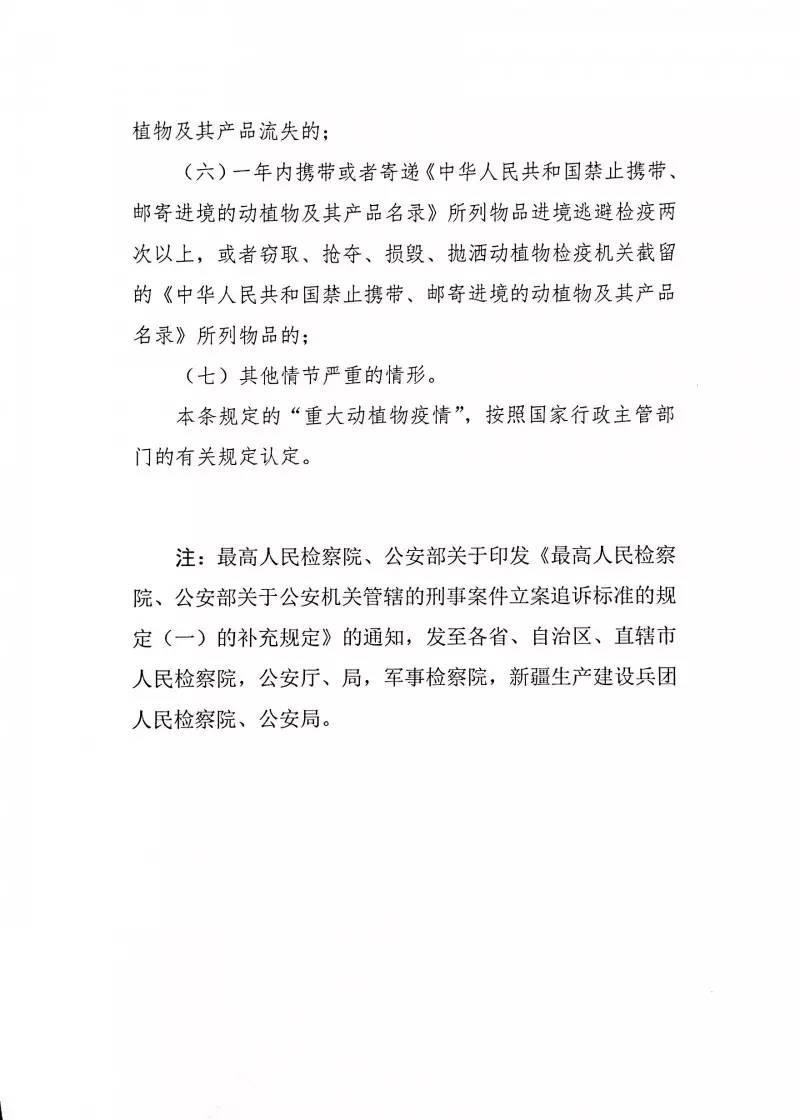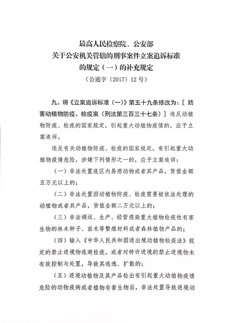 不久前,最高人民检察院、公安部联合发布了《关于公安机关管辖的刑事案件立案追诉标准的规定(一)的补充规定》(公通字〔2017〕12号),其中第九条对【妨害动植物防疫、检疫罪】立案追诉标准作出重大修改,明确规定: