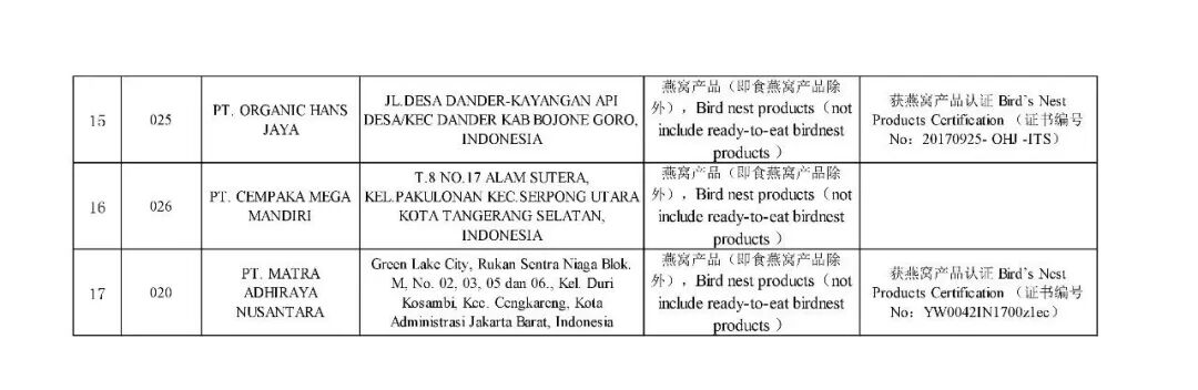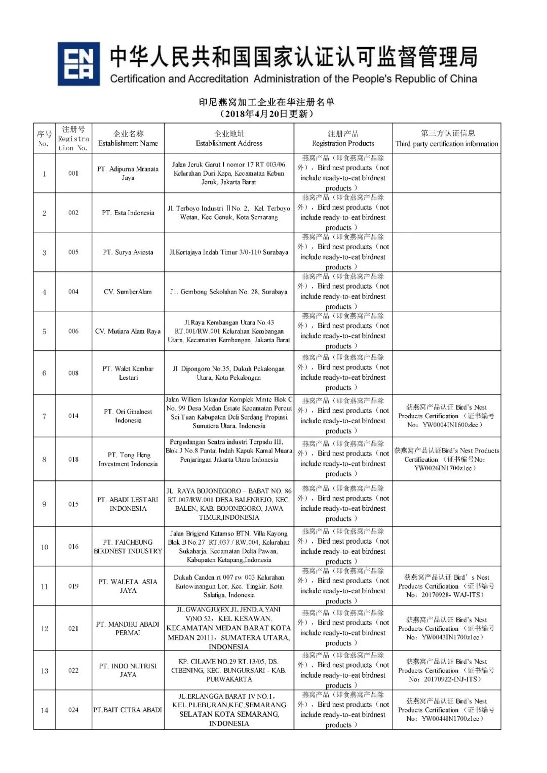 印尼燕窝加工企业在华注册名单 (2018 年4 月20 日更新)-燕窝市场门户网站