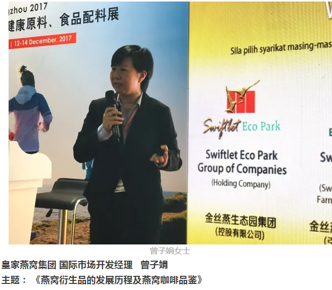 曾经理跟与会者分享了金丝燕的燕窝相关衍生品及燕窝咖啡品鉴的相关知识。她指出,马来西亚的燕屋数量预计到2020年约有100000间燕屋,燕窝市场前景明朗,发展势头迅猛,并表达出马来西亚农业部兽医局支持燕窝代替鱼翅的美好愿景。皇家燕窝集团和北京大学医学部合作把燕窝萃取标准化,推动燕窝行业标准规范化的积极发展。