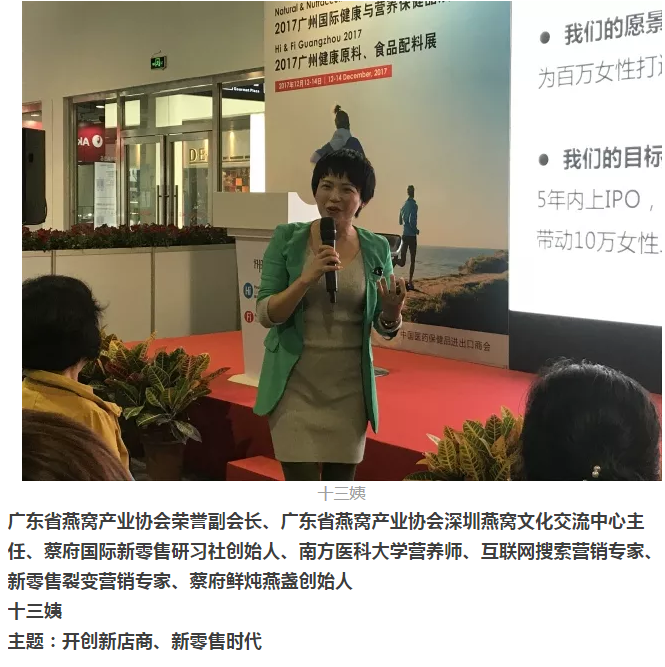 十三姨作为一位燕窝行业实干家在沙龙会现场向大家分享了企业的品牌化管理,未来,线上与线下零售深度结合,纯电商的时代很快将结束,纯零售的形式也将被打破,新零售将引领未来全新的商业模式。将“与消费者建立强链接”作为搭建新零售运营体系的原则。她说,做燕窝产品,提倡不仅生活方式,更是一种情怀。