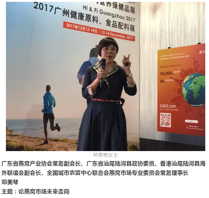 邓美琴女士跟与会者回顾了近年来燕窝行业发展的坎坷历程并分享了传统的燕窝经营模式。由于资质参差不齐,且上游采购环节无法得到保证,她认为,做燕窝行业,要把控企业上游和终端的稳定性,打破消费者信任危机,共同推动燕窝行业规范建立,才能确保燕业的长久的繁荣之像。并指出医药连锁是今后燕窝零售的走向,很受大众信赖,未来市场潜力大。