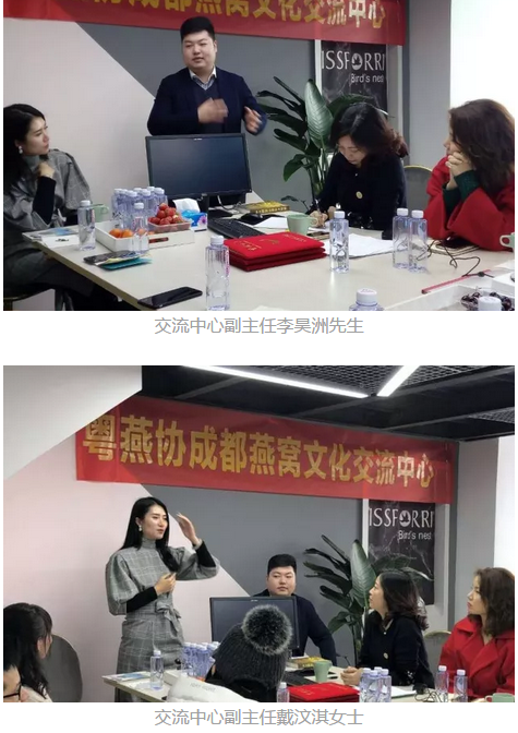 成都交流中心主任蒲燕萍女士、副主任李昊洲先生、戴汶淇女士分享了自己多年在行业的经营以及发展的需求,表达了协会对企业的指引与帮助、行业间抱团发展的必要性,各位燕窝同仁们也分别作了自我介绍,分享了一些经营心得与面临的实际困难,预测未来的发展趋势与部署,同时真诚地表达出对协会和交流中心未来的期望,期待交流中心能充分发挥当地的资源优势,抱团交流,共同促进燕业发展!