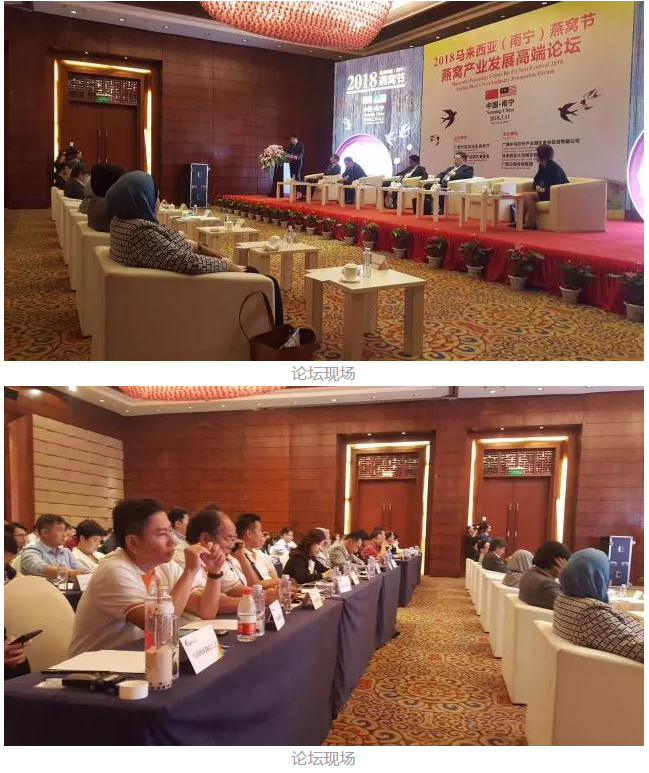 当天下午3:00-5:30,燕窝节高端产业论坛在万豪酒店举行。自治区商务厅副厅长马继宪、马来西亚农业与农基工业部兽医局局长古瓦沙·尼扎慕丁、中马钦州产业园区管委会常务副主任高朴、南宁海关、广西出入境检验检验局等领导就毛燕输华进展情况,燕窝相关技术标准,准入条件等内容进行了分别的介绍。