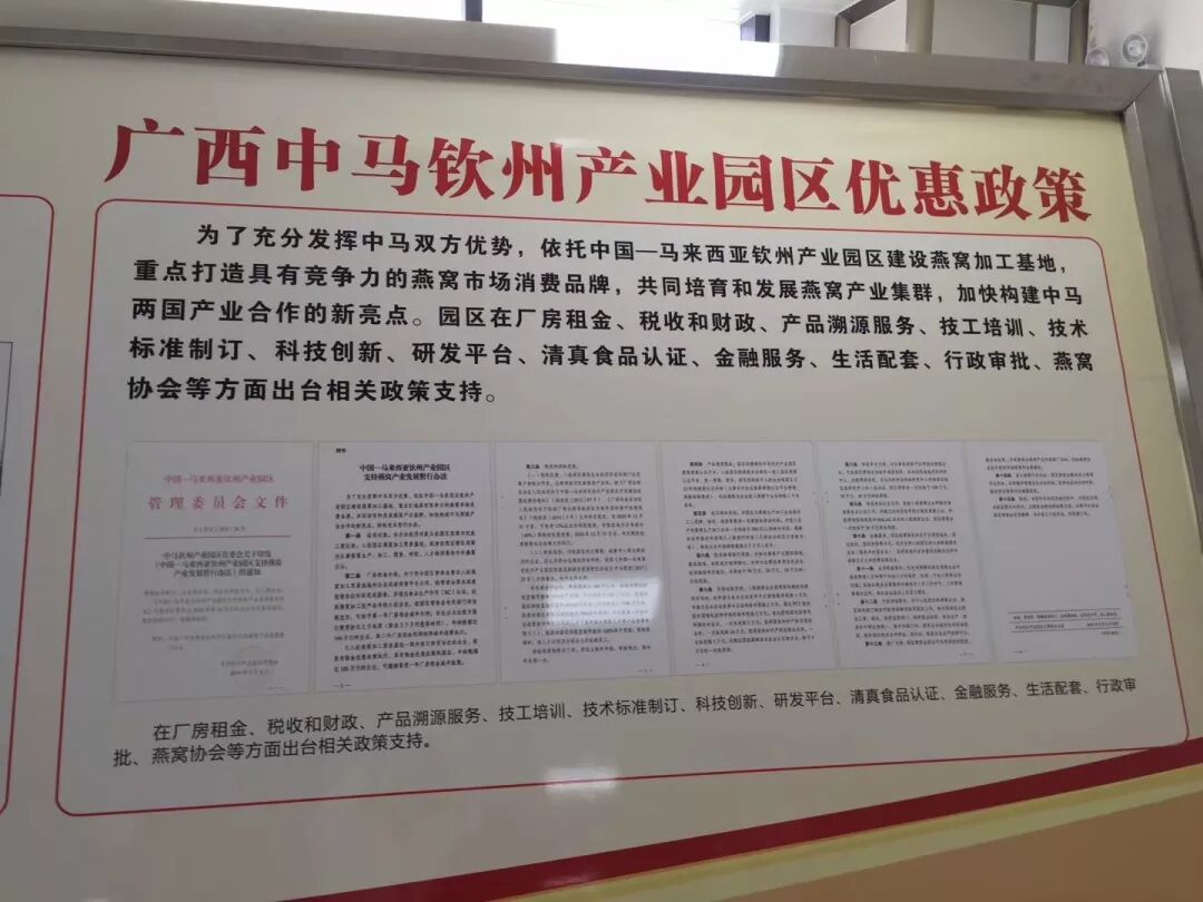 9月14日,粤燕协东盟博览会商贸团,前往广西中马钦州产业园及燕窝加工贸易基地参观,并受到广西中马钦州产业园园区管委会莫福文副主任与投资合作局李远华副局长等热情接待,在浏览了整个园区的基础建设,并重点参观海关检验检疫中心及燕窝加工贸易基地后,园区管委会专题组织粤燕协商贸团召开了“燕窝产业发展座谈会”。