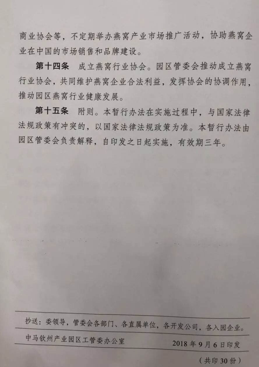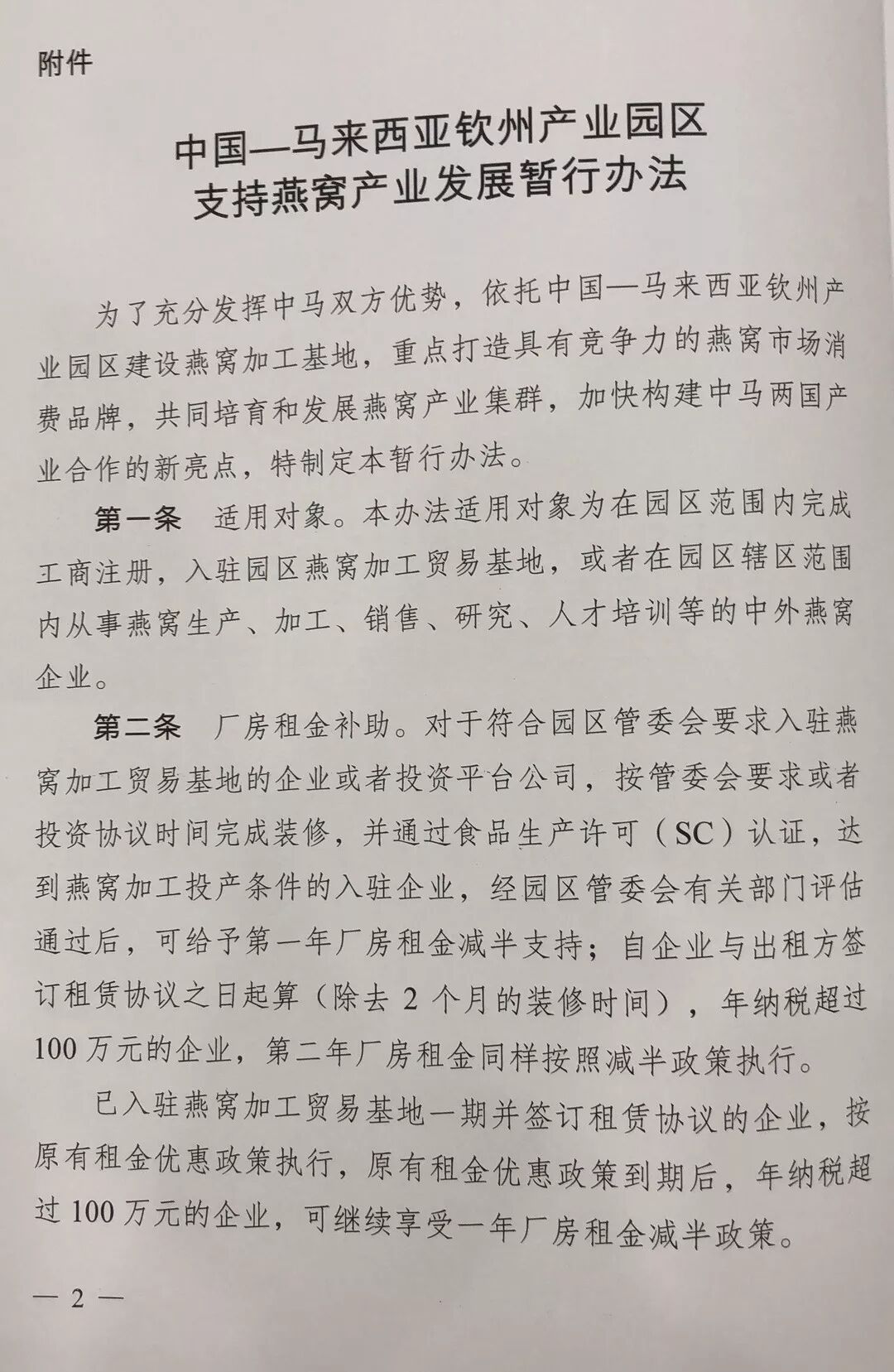 -马来西亚钦州产业园(以下简称“中马产业园”)是中外政府合作建设的国际园区,中、马两国将在“两国一检”、国际产能合作、联合招商等方面加强合作。作为中马产业园重点项目,钦州口岸成为首批马来西亚毛燕进口指定口岸之一,进口毛燕将在该产业园完成加工后在国内销售,预计2019年进口燕窝加工能力将达到200吨。