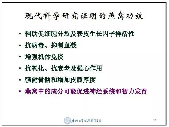 比如:辅助促细胞分裂及表皮生长因子样活性;抗病毒,抑制血凝;增强机体免疫;抗氧化、抗衰老及强心作用;强健骨骼和增加皮质厚度;燕窝中的成分可能促进神经系统和智力发育等,这个成分就是燕窝中独特价值的“唾液酸”,“唾液酸”会自身产于很多地方,例如母乳,所以健康育儿必须母乳喂养。在孕期第26周-1周岁,是胎/婴儿大脑发育的关键期,此时,母体补充“唾液酸”是非常有必要的!在所有的食物中“唾液酸”含量最高的就是燕窝,所以也叫“燕窝酸”。