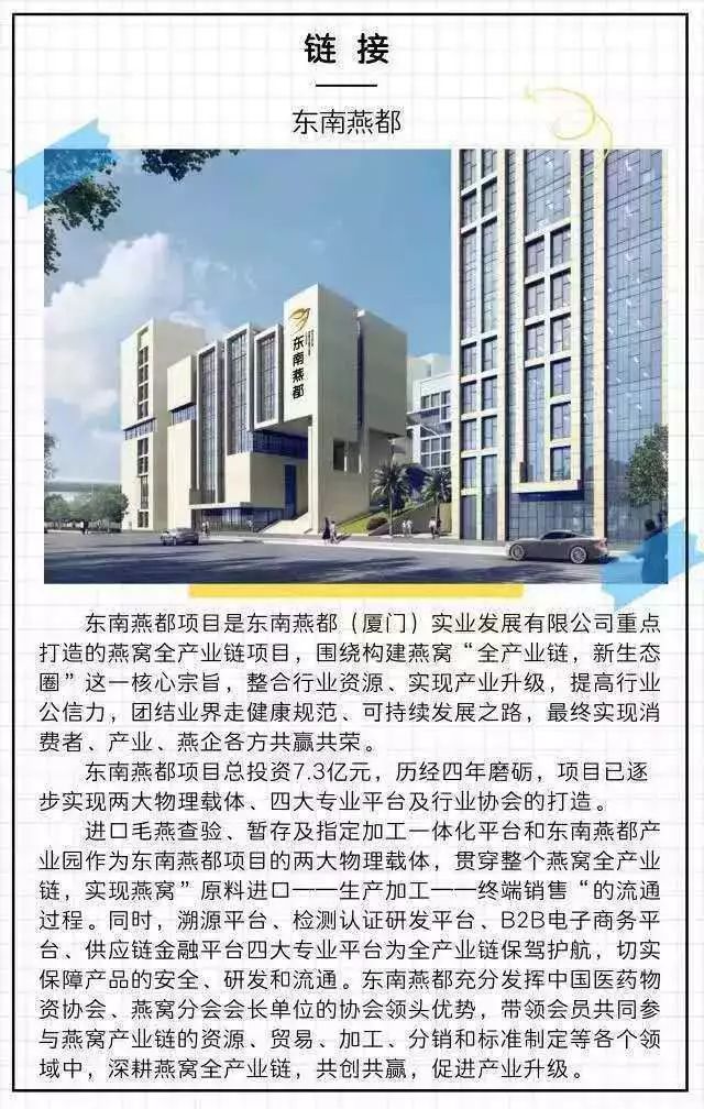 东南燕都产业园,地处闽南中心地段,占地19478.45㎡,总建筑面积70568.3㎡,它是集“全球溯源燕窝集散中心,原料加工中心共享工厂、燕窝主题工业旅游基地”一体的大型燕窝产业综合体。2018年7月29日,海关总署官网正式公布了东南燕都与广西钦州中马产业园,作为首批250吨与15吨的进口毛燕指定加工企业。