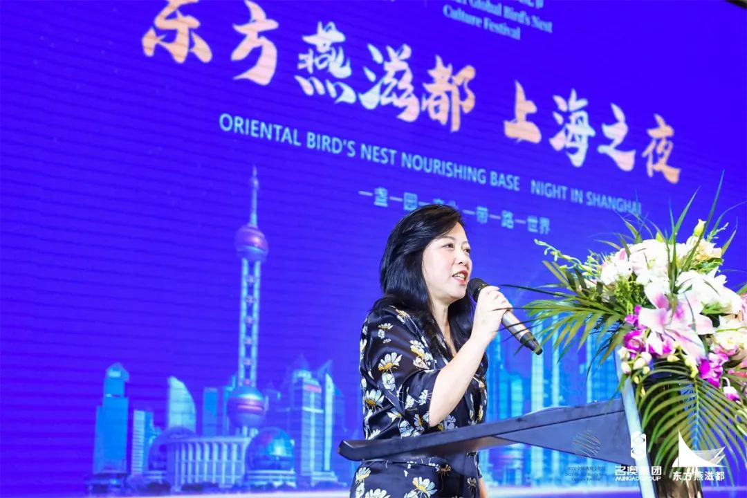 在热烈的氛围中,粤燕协会长张雅琴发表了热情洋溢的致辞。她首先感谢东方燕滋都的大力支持和精心安排,充分肯定了东方燕滋都在燕窝行业新生态发展方面所做的努力,并看好项目在带动产业聚集,规范行业健康发展方面所发挥的积极作用,并祝在座的各位嘉宾共同度过一个美好的上海之夜。
