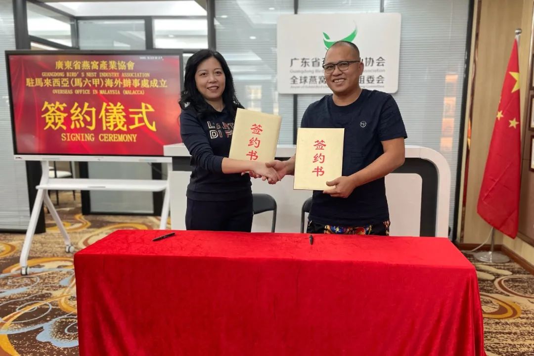 随着中国“一带一路”的战略发展规划,为促进中马两国燕窝行业的健康发展和合作共赢,粤燕协经与燕窝农庄(马)有限公司商议后,决定在马来西亚马六甲设立海外办事处。该办事处将在粤燕协的领导和监管下,协助协会履行有关的职责和海外文化交流、服务与资源对接。11月18日下午,在粤燕协举行了简单而隆重的签约仪式,张雅琴会长与燕窝农庄代表陈健英先生签订了粤燕协驻马来西亚(马六甲)海外办事处合作协议,燕协家人在海外又多了一个娘家!