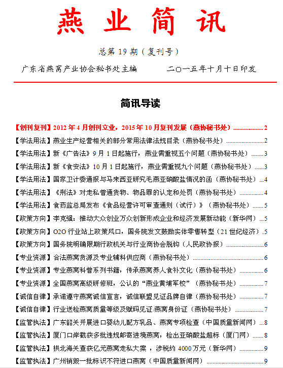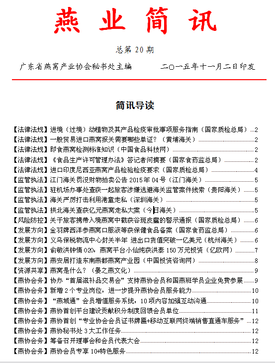 2015年11月11日,广东省燕窝产业协会执行会长兼秘书长徐兵、助理秘书长周雷、副秘书长李泓苇拜访参观印尼长荣燕窝,长荣燕窝是CNCA注册印尼燕窝加工企业006号。李宏伟副秘书长代表燕协向长荣燕窝许总赠送文化礼品《燕窝纪念邮折》第一册,《解开燕窝密码》科普书籍 ,《燕业简讯》总第19期和总第20期。