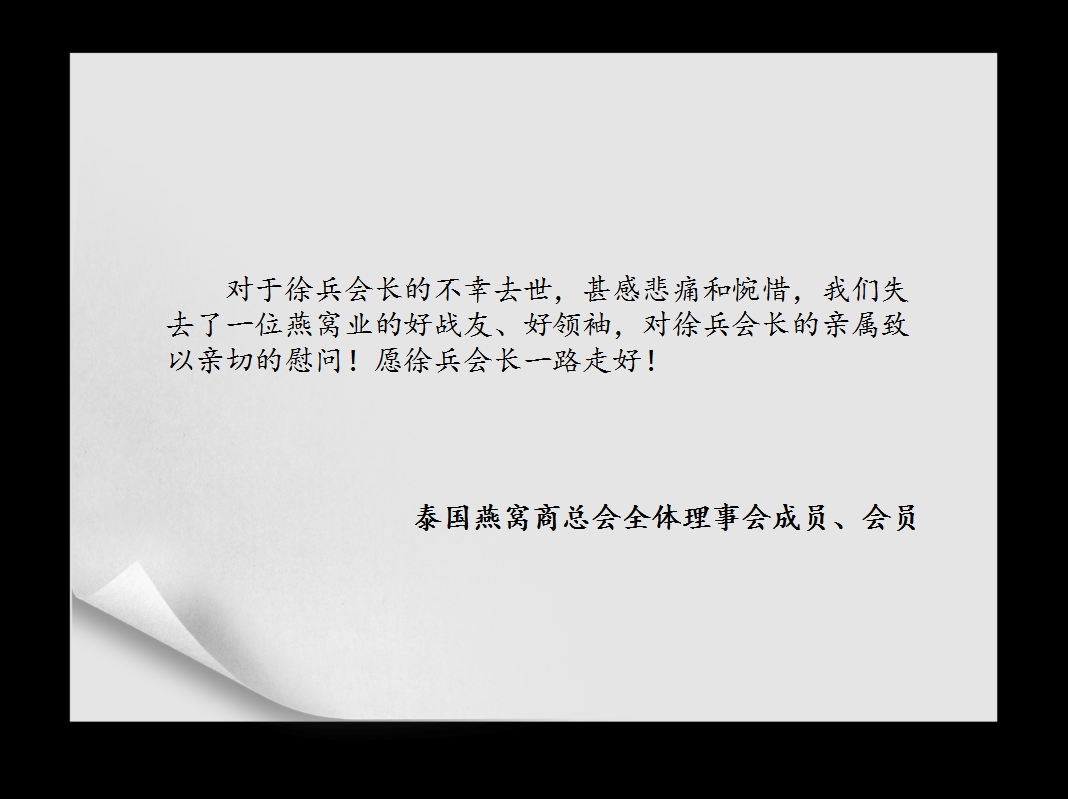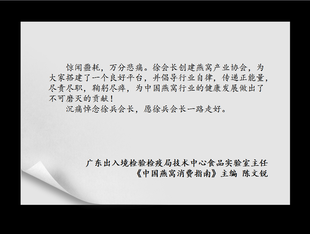 徐兵同志古道热肠,敬事和融,对专家学者敬重有加,对会员同行慷慨扶植,对下属晚辈谆谆教导,对家人朋友真诚以待。他致力于燕窝行业的发展,就连他最后的告别,也成就了行业另一次盛会,这是徐兵会长乐于见到的,我们忍痛在此与他告别,但他高尚的人格魅力和积极进取的领袖精神,将永远感召我们燕窝行业的同仁虔诚为人、为学、为商,更加团结,更加努力,继承他的遗志,继续他未竟的事业,共同推动燕窝产业健康长足发展!