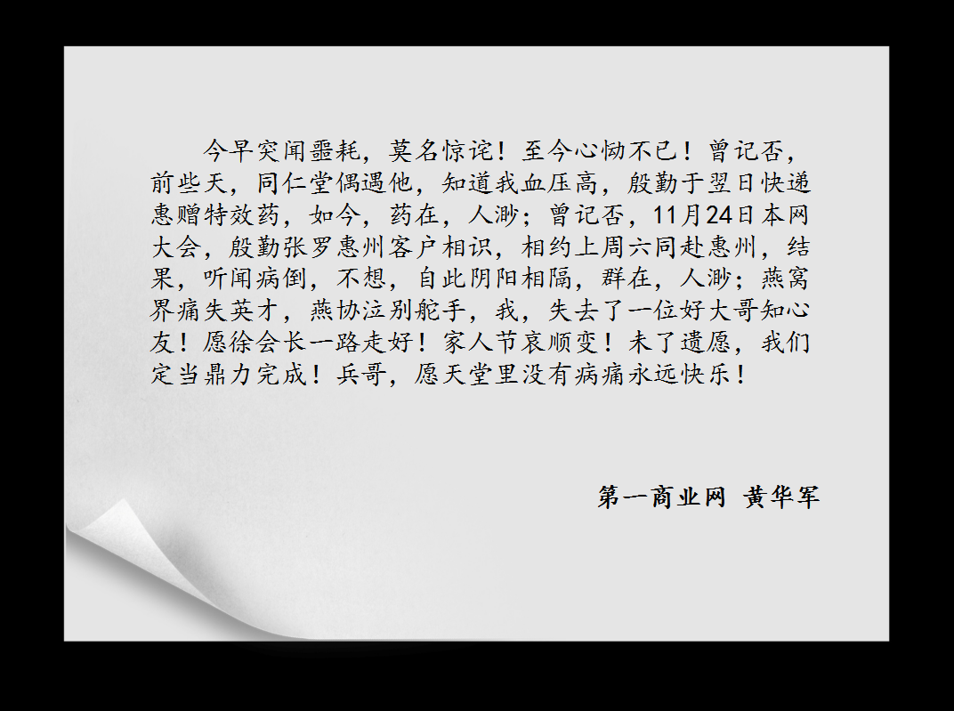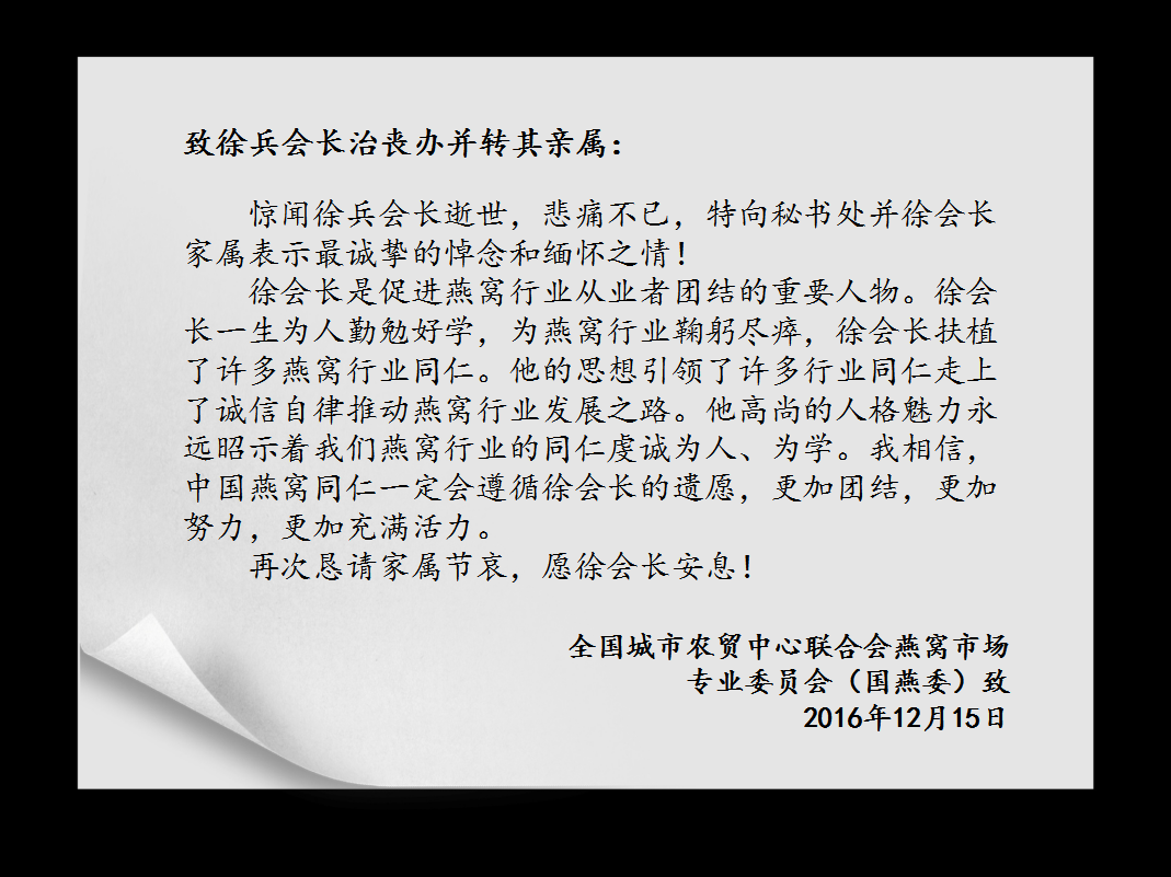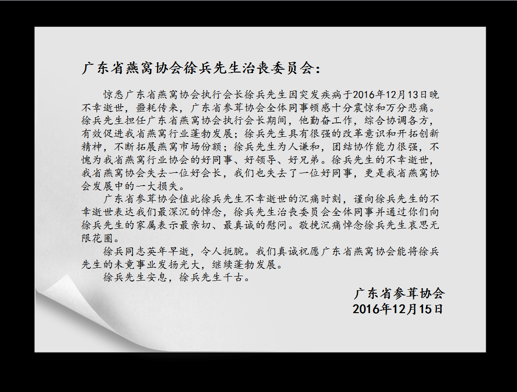 广东省燕窝产业协会执行会长徐兵同志,于2016年12月13日晚10时,因心脏病突发救治无效,与世长辞,享年48岁。