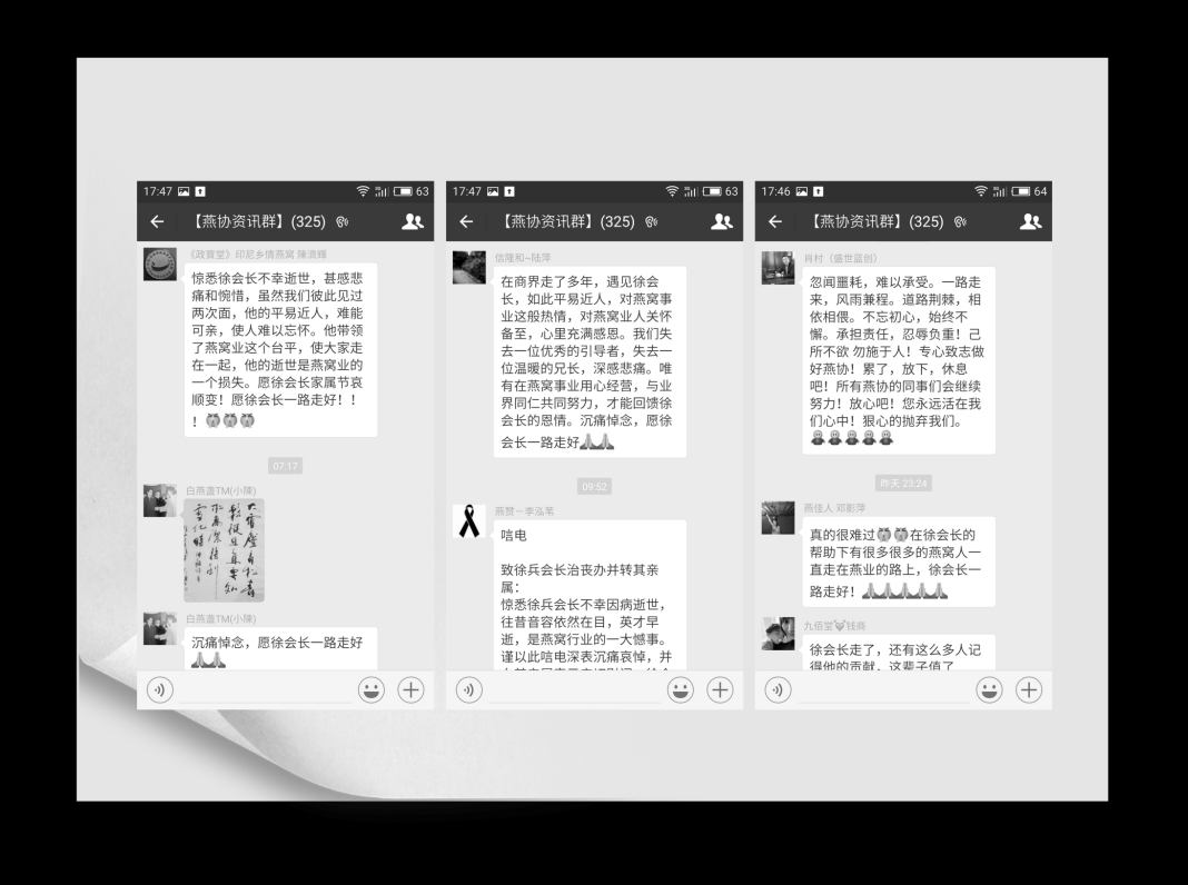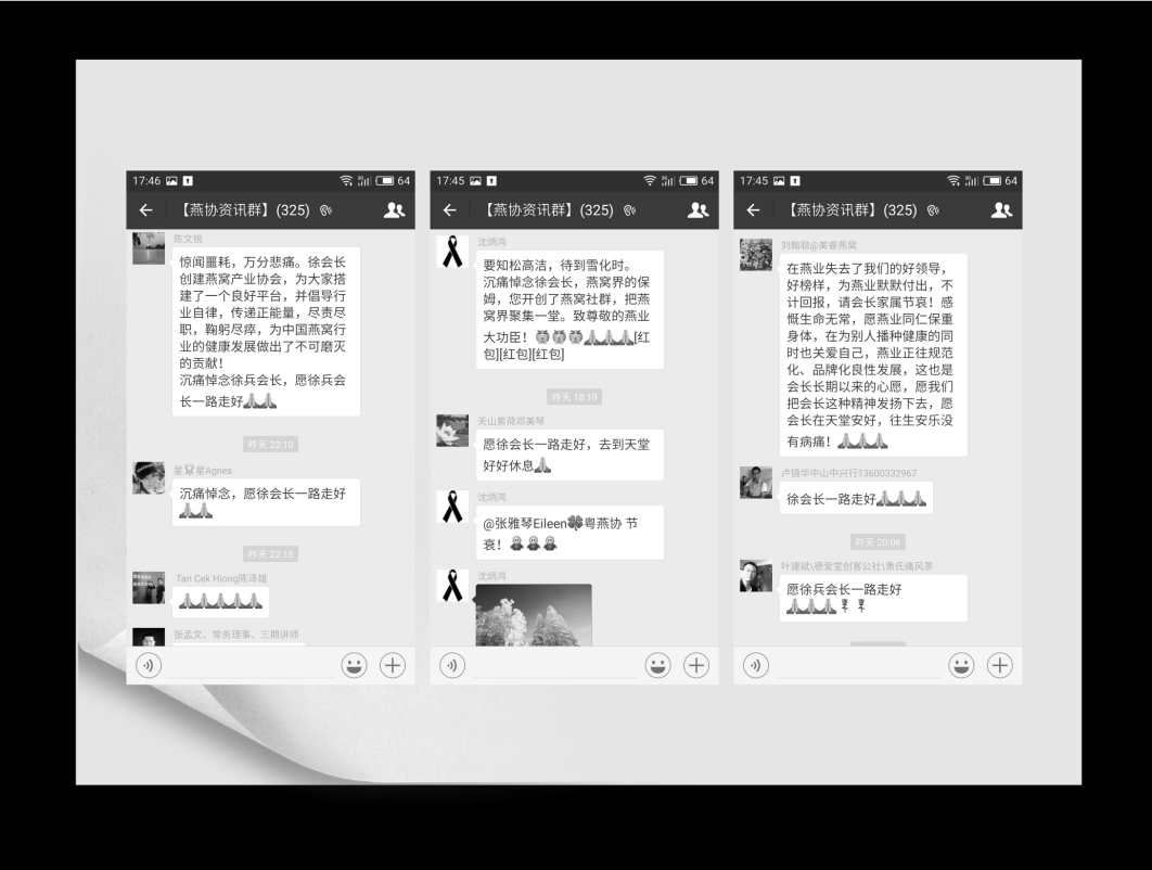2016年12月16日(周五)10点在广州市殡仪馆白云厅举行了徐兵同志的追悼会。广东省餐饮服务行业协会、广东省参茸协会、广东健康食品协会、燕窝产业国际联盟、第一商业网、珠海市万联云燕供应链管理有限公司、厦门燕之屋生物工程发展有限公司、马来西亚皇廷燕窝、新加坡商道有限公司、青海大漠红枸杞有限公司、湖南预备役师、北京大成律师事务所等100多家机构、公司和会员企业派代表参加了徐兵同志的追悼会。广东检验检疫技术中心、广东省保健食品行业协会、印尼燕窝商会、泰国燕窝商总会、马来西亚燕窝上下游公会、马来西亚皇家燕窝集团、印尼小鸟公司、注册认证燕窝诚信联盟、国燕委、广州阳光酒店等200余家机构和多家会员企业为徐兵同志敬献了花圈。