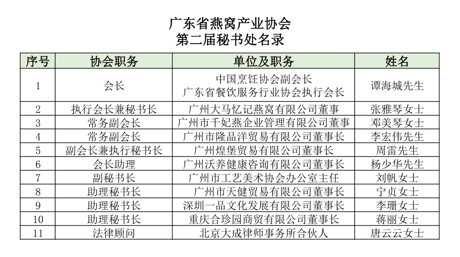 广东省燕窝产业协会第二届会长及秘书处名录
